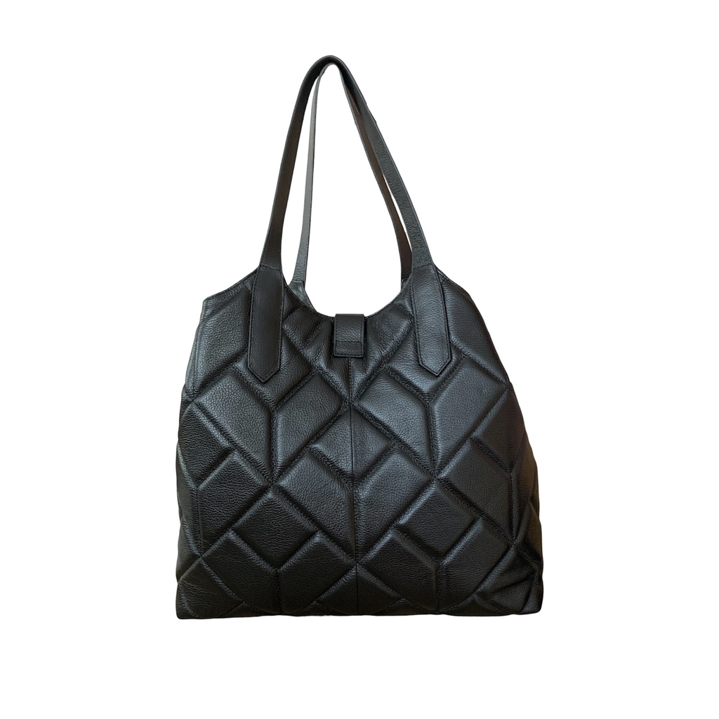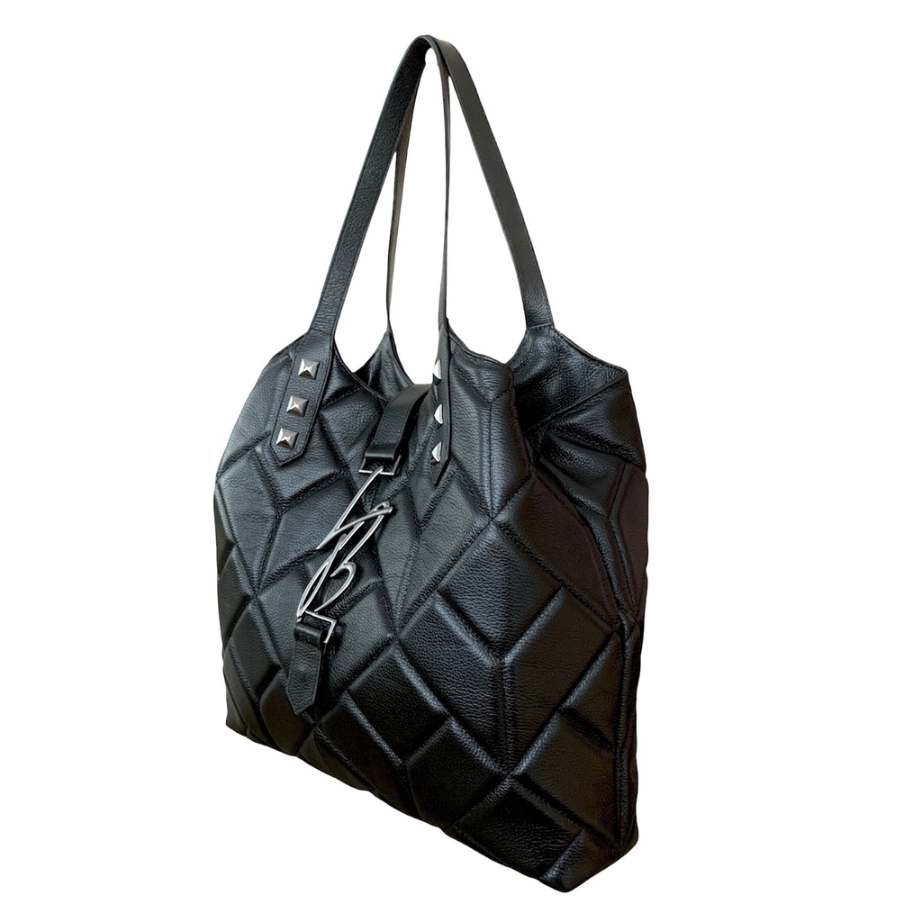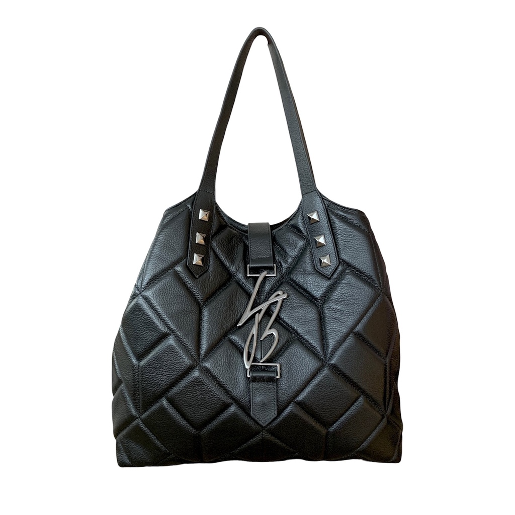 Em produções modernas, a bolsa grande hobo Luiza Barcelos traz autenticidade e elegancia ao look. O modelo é produzido em couro no tom preto, possui shape grande com acabamento matelassê, duas alças fixas de mão com detalhes de rebites piramidais, um compartimento amplo interno, uma bolsinha interna removível e fecho central com as iniciais LB.