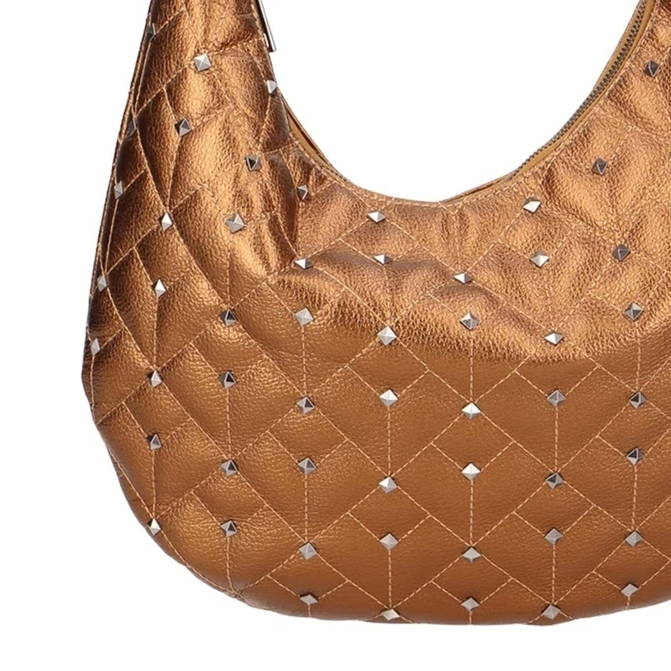A nova bolsa hobo Luiza Barcelos é produzida em couro metalizado no tom brown, possui acabamento em matelassê no formato do clássico monograma da marca, é inteiramente adornada por rebites metálicos e possui compartimento interno com divisórias, alça em couro e fechamento por zíper.