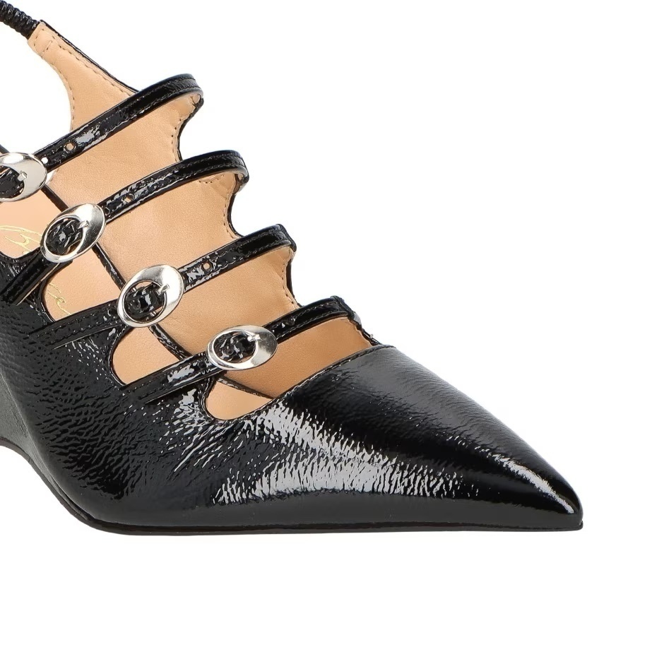 O novo scarpin slingback Luiza Barcelos dosa a elegância do clássico com o charme do novo. Produzido em material tecnológico verniz, no tom preto, o modelo possui salto alto anabela geométrico e é decorado por tiras paralelas com fechamento por fivela.